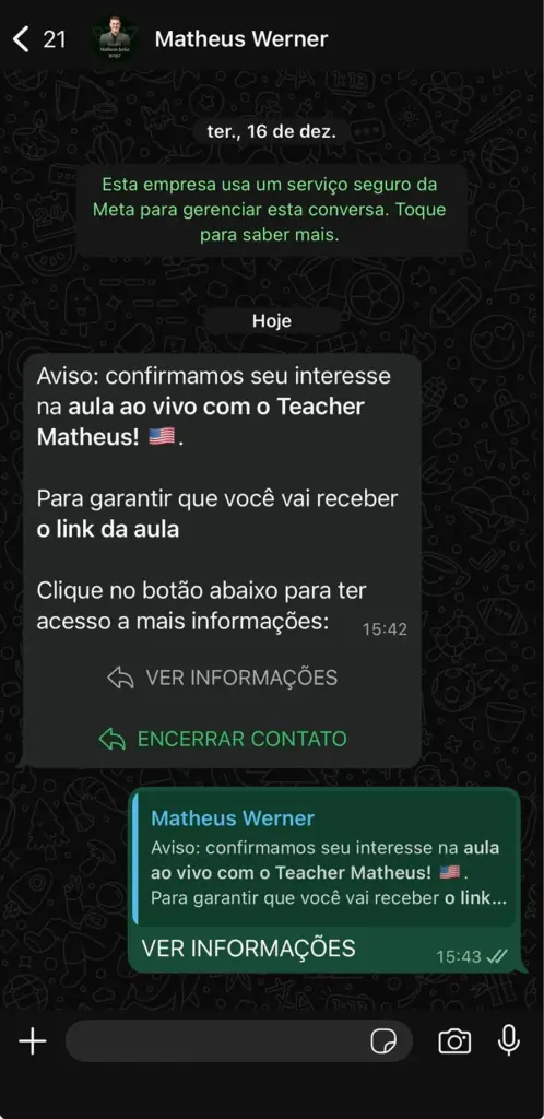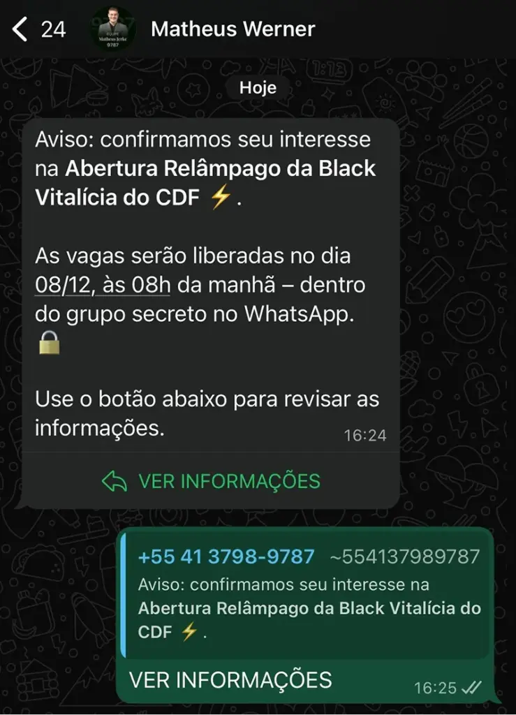 Ao confirmar sua inscrição e entrar no Grupo de Interessados, você receberá uma mensagem automática do nosso número oficial.